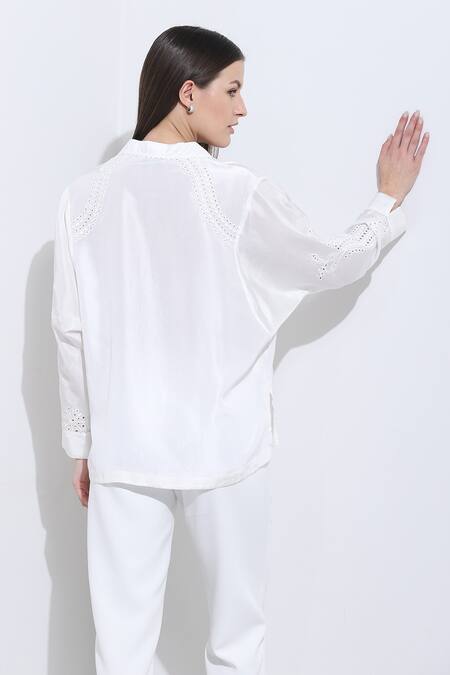 Floral cutwork details on the sleeves and front., Collared neckline for a sophisticated look.