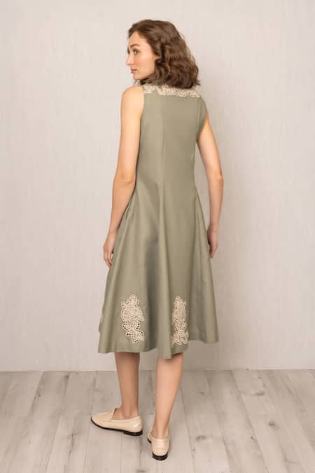 Sage green sleeveless midi dress featuring intricate lace embroidery at the hem and collar.