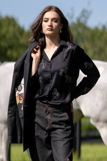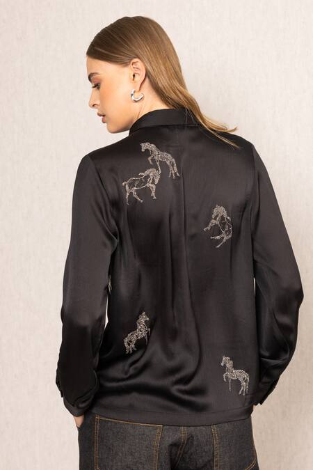 A black button-down shirt crafted from royal georgette, featuring an all-over crystal-embellished horse motif.