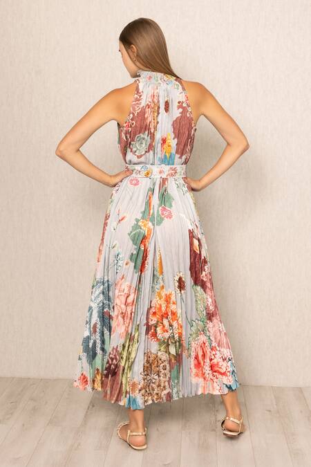 Multi color pleated maxi dress featuring a high neckline and a belted waist.