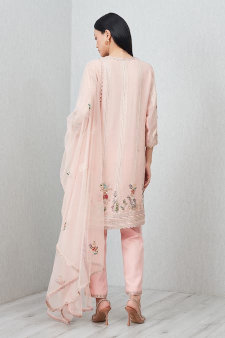 Pink kurta featuring floral embroidery and a V-neckline. Paired with matching pants and a dupatta.