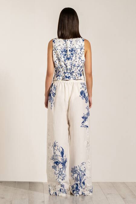 Cream Viscose Embroidery Mira Wide Leg Pants