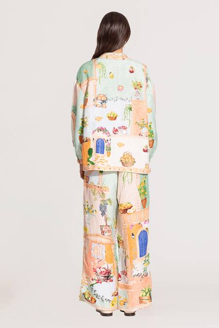 Detailed fruit and floral motifs, Button closure with vibrant colors, Relaxed fit with long sleeves