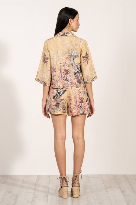 Gold cropped collar shirt made from a linen blend featuring floral prints