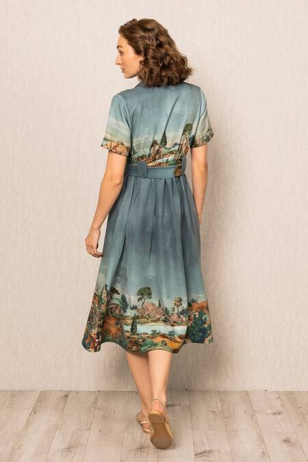 Scenic print depicting landscapes, Belted waist for structured fit, Pleated skirt for added movement