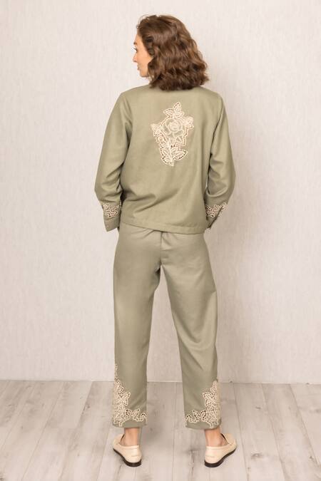 Sage green pant crafted from poly flex featuring intricate lace embroidery.