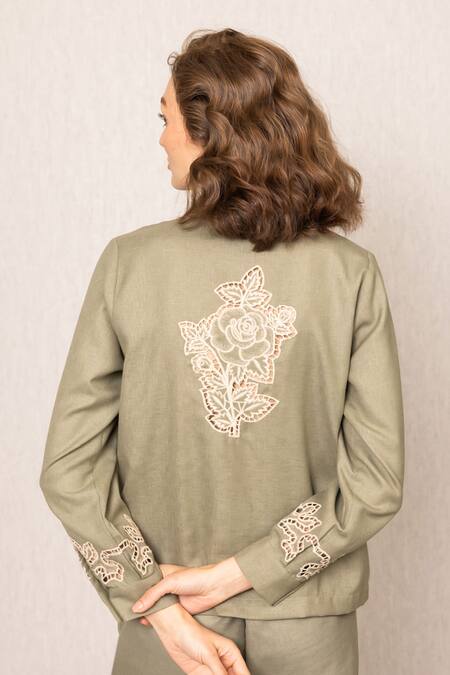 Intricate floral embroidery on sleeves, Embroidered rose motif on the back, Decorative collar with embroidery