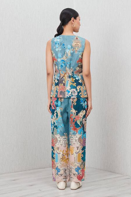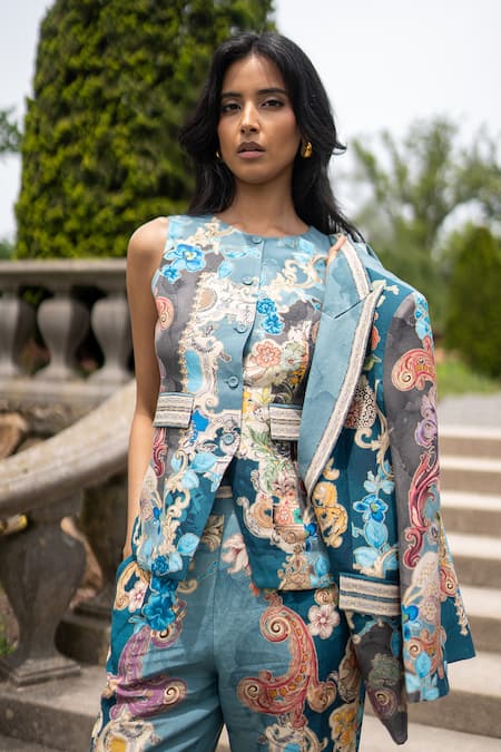 Blue Linen, Viscose Applique Round Neck Soline Baroque Print Waistcoat