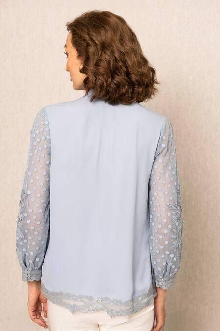 Blue blouse featuring embroidered floral designs and polka dot mesh sleeves.