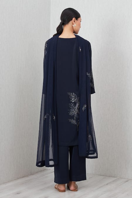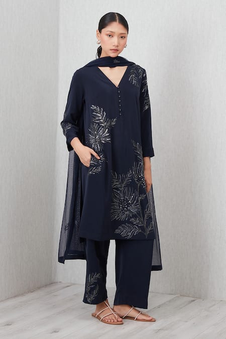 Navy Crinkle Embroidery, Sequins V-neck Tara Kurta Set