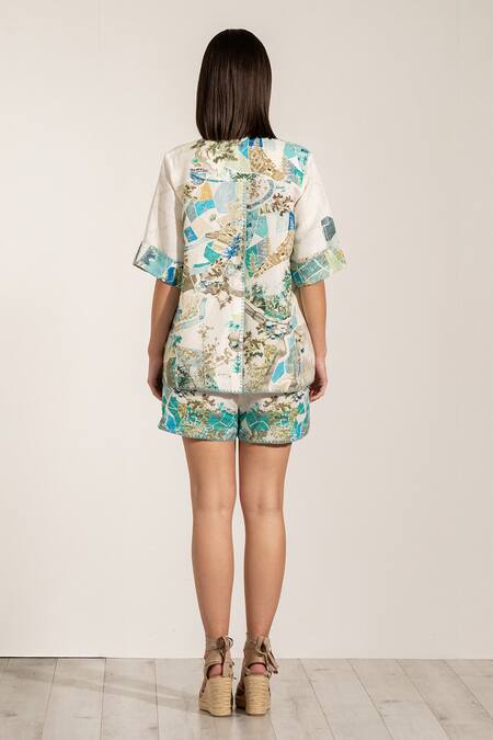 Teal Globe printed buttondown shirt made from viscose linen fabric