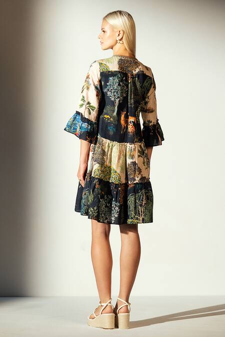 Multicolored tiered dress with Amazon forest print in linen blend base.