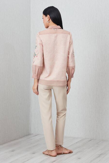 Peach shirt featuring intricate floral embroidery on the front and sleeves.