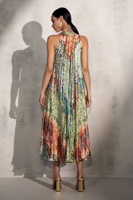 Multi color sleeveless halter neck dress with all over shimmer gardenia print & pleats at the front.
