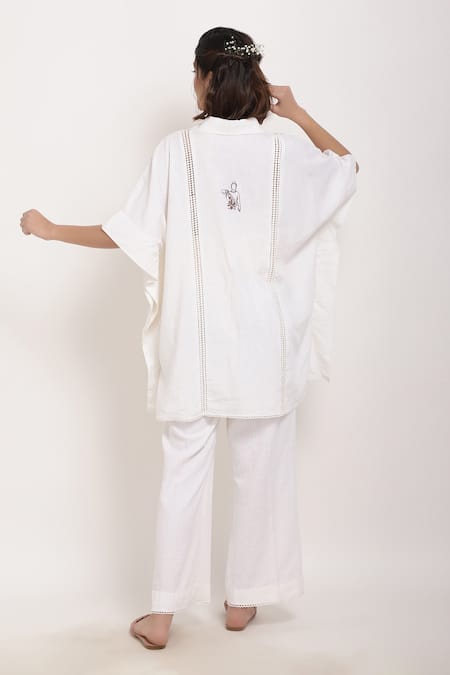 White kaftan style maternity tunic with spread collar and embroidered placement motif at the back. Comes with a palazzo.