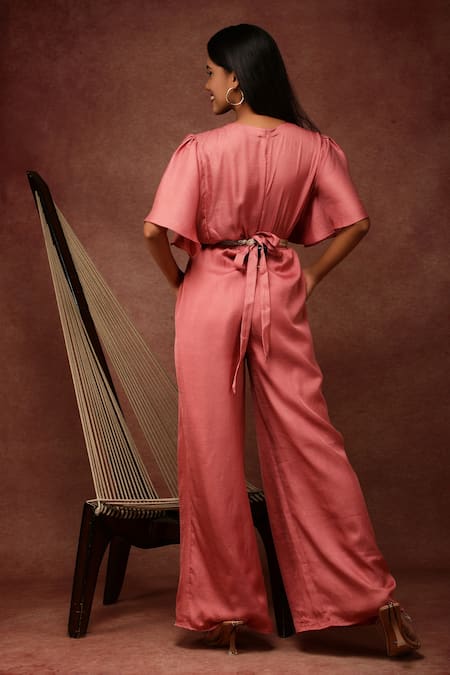 Pink Semi Silk Satin V Neck Neckline Embroidered Jumpsuit