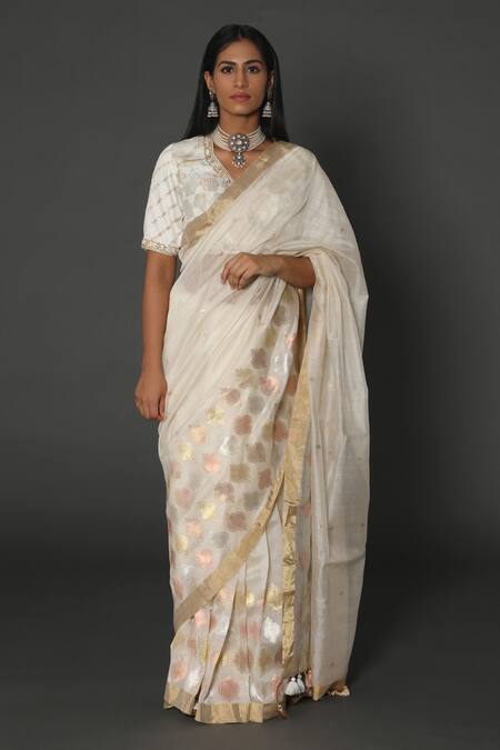 Ivory saree featuring ogee butti hand embroidery and a side zip closure. Paired with a matching blouse in Chanderi handloom fabric.