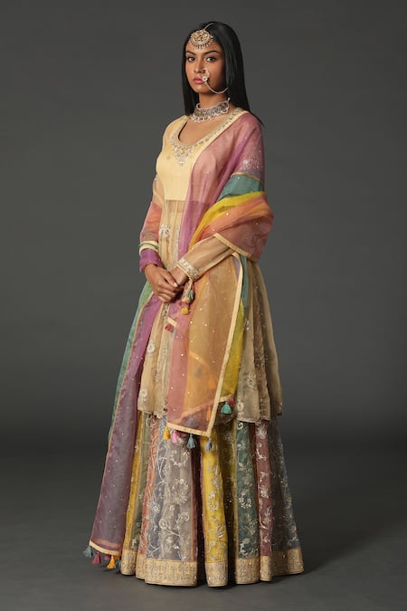 Multi color lehenga featuring hand embroidery with sequins and aari work. Paired with a beige peplum blouse and a floral applique dupatta.