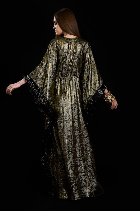 Gold and black kaftan featuring hand embroidered lace detailing and tassels on the sides