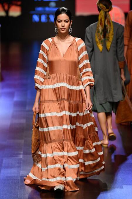 Give way to effortless summer evenings with this crochet lace detailed, tan brown hued flowy silk maxi dress.