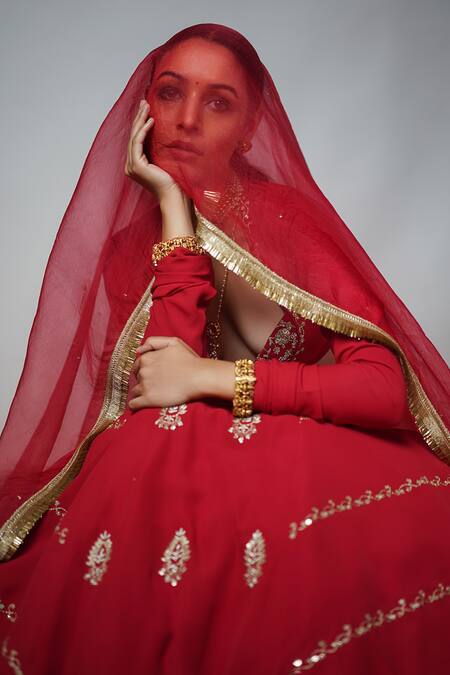 Red viscose georgette lehenga with inverted box pleats, butti, leheriya pattern sequin & zari hand embroidery. Paired with plunged sweetheart neck blouse with churidar sleeves, embroidered panels & silk organza dupatta with fringe tasselled border.