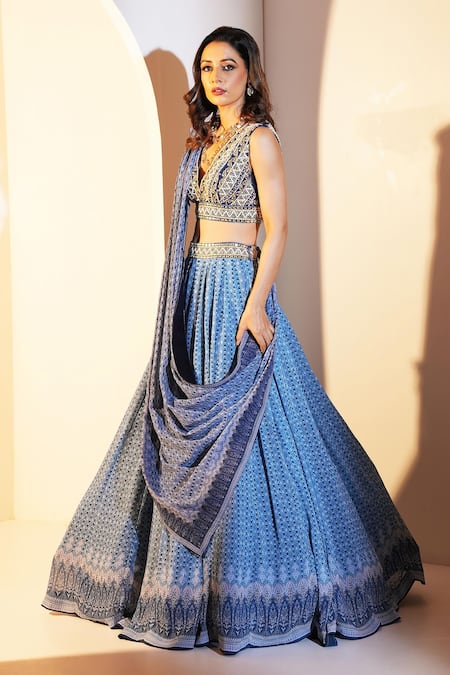 Blue georgette lehenga featuring hand embroidered abstract print with a side zip closure. Comes with a padded blouse and a dupatta.