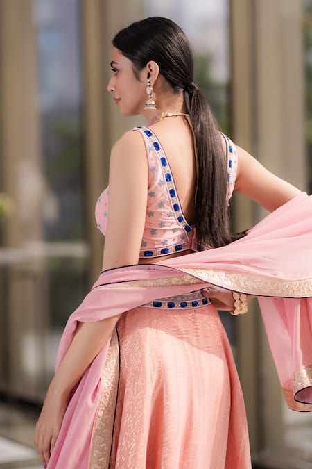 Pink shiny lurex lehenga with sequin and mirror embellished waistband. Comes with blouse and dupatta.