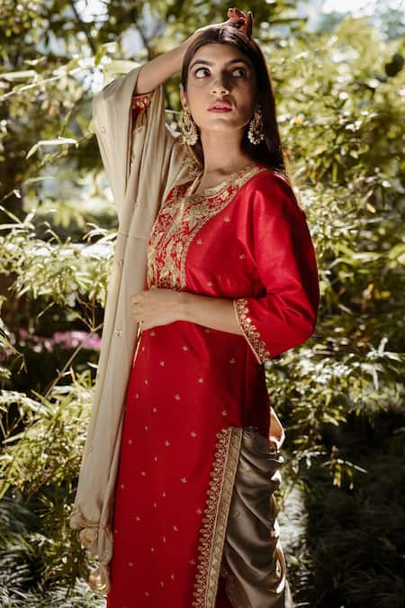 Red Kurta And Pant Dupion Dupatta Satin Round Embroidered Set