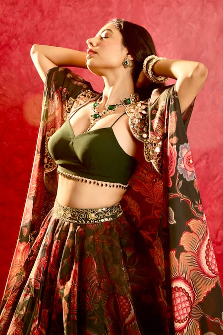 Green lehenga featuring floral print with embroidered scallop border. Paired with a sleeveless bustier and open cape with flared sleeves.