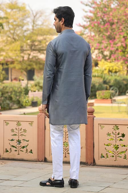 Grey kurta featuring cross stitch detailed yoke and threadwork on the neck