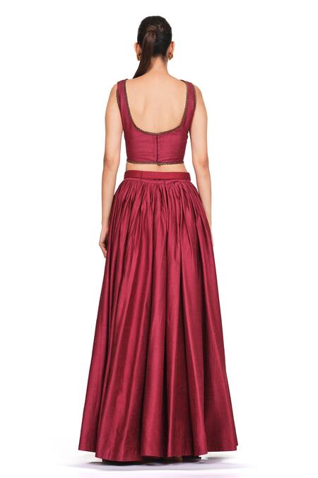 Maroon Raw Silk Cutdana, Floral Boat Neck Blouse And Skirt Set