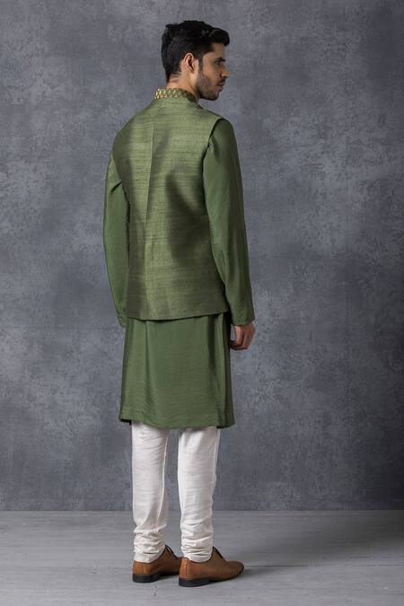 Olive bundi with woven collar & patch pocket. Paired with handwoven Chanderi cotton silk kurta & churidar.