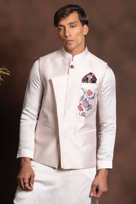 Pink raw silk bundi featuring a floral embroidered motif and a quilted front panel. Paired with a plain asymmetric kurta and pant.