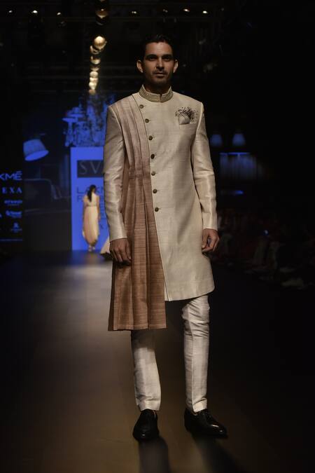 Buy_Sva By Sonam & Paras Modi_Beige Raw Silk Embroidered Beads Drape Layer Sherwani With Pants_at_Aza_Fashions