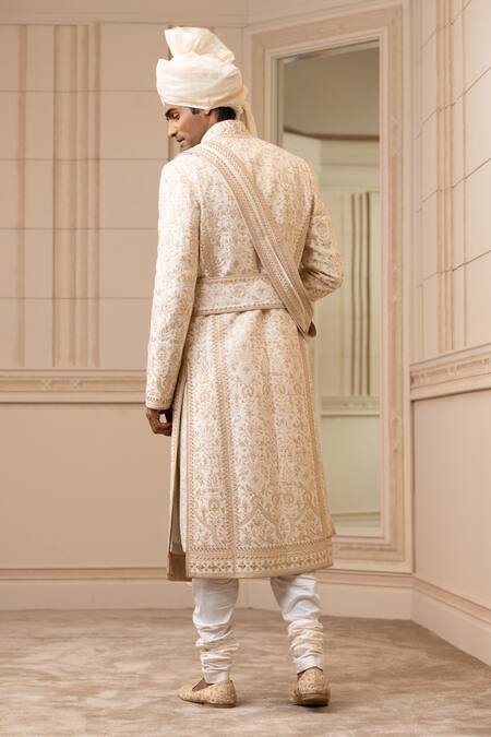 Ivory, taupe sherwani embroidered all-over in aari and zardozi threadwork & highlighted with Swarovski crystals. Paired with an ivory chanderi-jacquard kurta and churidar. Comes with embroidered kamarbandh & stole.