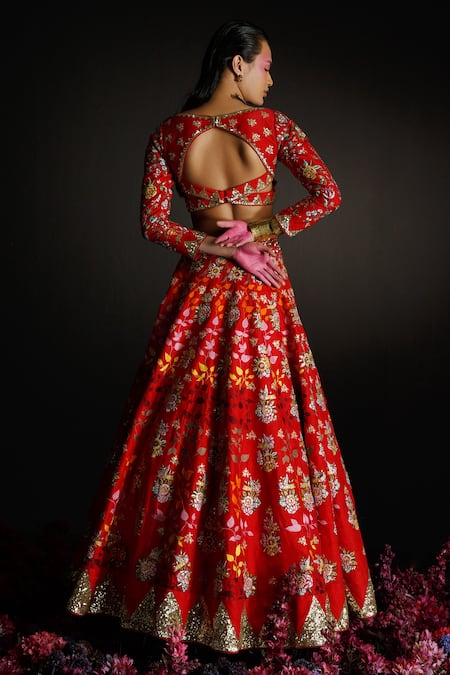 Red Raw Silk Sequin, Thread Work V Neck Floral Embroidered Bridal Lehenga Set