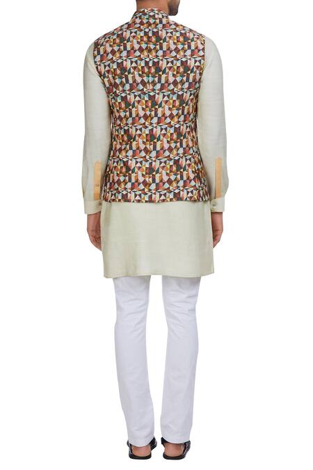 This vivid multicolored nehru jacket is made in pure raw silk fabric, enhanced in a geometric pattern all over. It comes along with a cream long sleeve kurta made in glossy cotton silk fabric.