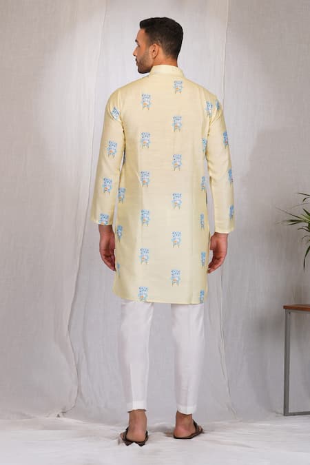 Yellow linen silk kurta with reading chair print. Paired with pant.