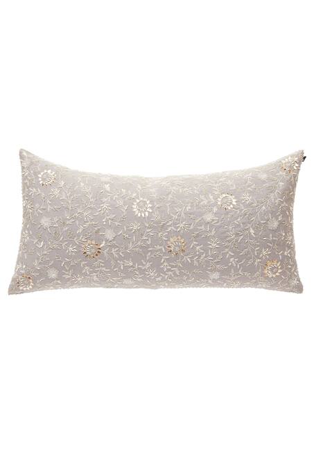 Grey rectangle-shaped cushion cover with all-over floral motif resham work. Comes with filler.