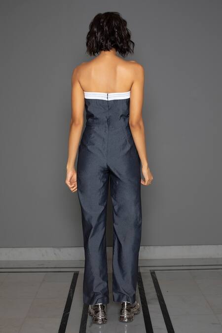 Charcoal tube straight jumpsuit with white grip detail and back zip closure in denim fabric.