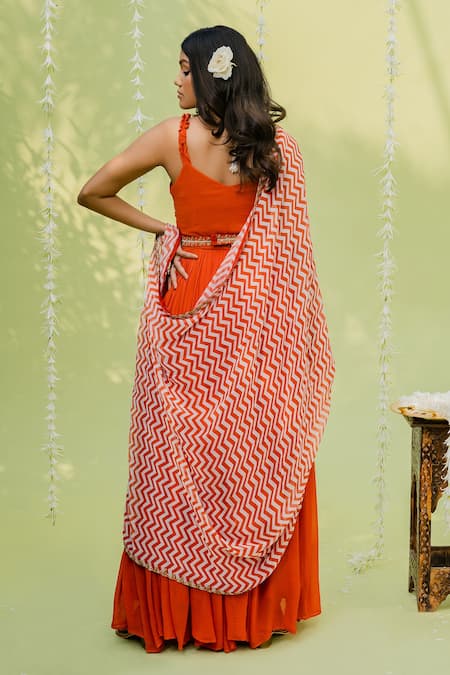 Reddish orange viscose georgette anarkali with kasab, cutdana, sequins, and moti hand embroidery. Comes with a chevron printed dupatta and a belt.