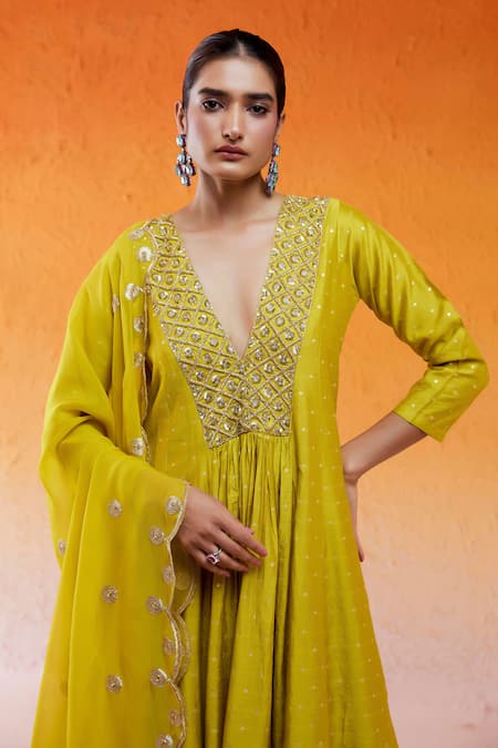Yellow chanderi anarkali featuring cutdana, sequins, and resham hand embroidery. Paired with a coordinating pant and scallop embroidered dupatta.