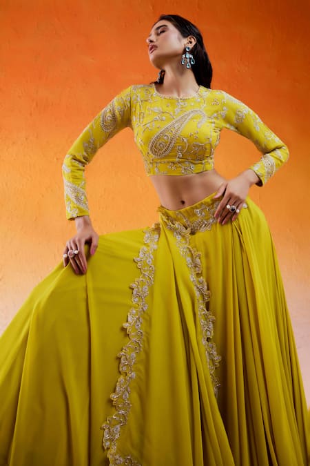 Yellow Viscose Embroidery, Cut Work Round Neck Daisy Lehenga Set