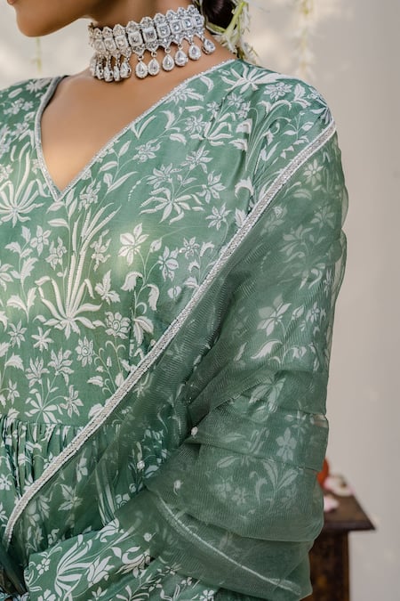 Olive green viscose crepe silk peplum with floral print, including cutdana and moti hand embroidery. Comes with flared sharara and a net dupatta.