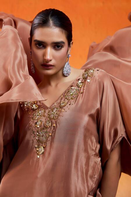 Brown kurta featuring a V-neckline and cascading slit sleeves with hand embroidery. Paired with a matching flared sharara, both crafted in a soft viscose natural crepe blend.