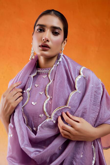 Lavender kurta featuring hand embroidered cutdana, sequin, and moti floral motifs. Paired with a plain flared sharara and scallop border dupatta.