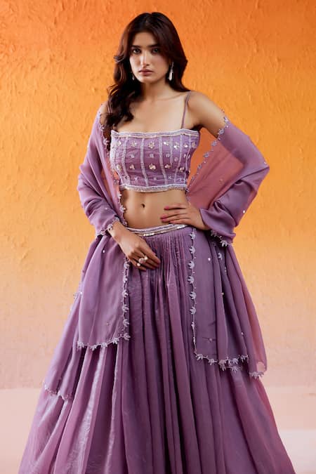 Purple hand embroidered lehenga featuring a crushed organza design. Paired with a matching hand embroidered blouse and a viscose organza dupatta.