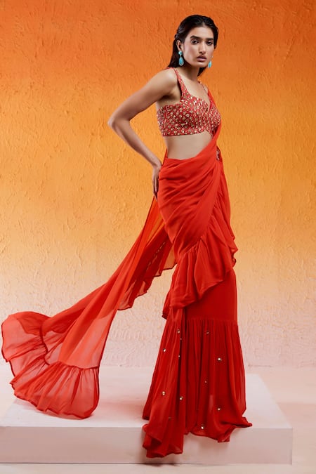 Red pre-draped saree in viscose georgette featuring ruffle details and a sequin embroidered hem. Paired with a hand embroidered blouse adorned with cutdana, moti, and resham work.