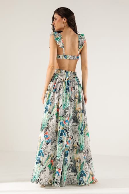 Off White Cotton, Crepe Advika Abstract Print Crop Top And Flared Pant Set