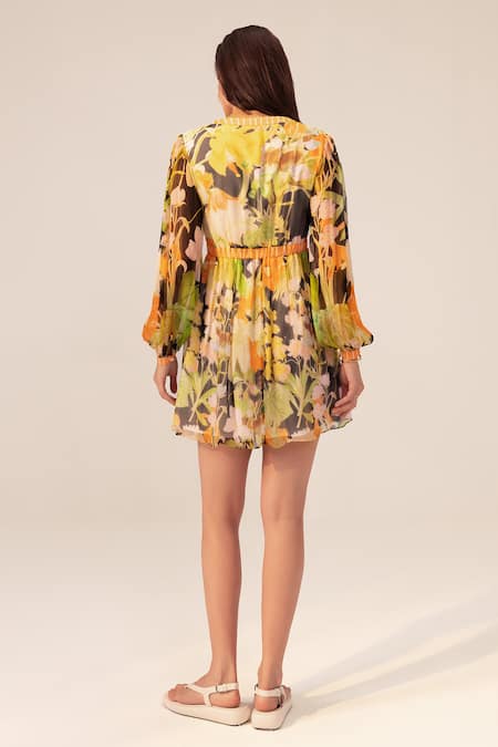 Black Bamboo Plunge Neck Camellia Garden Print Short Dress